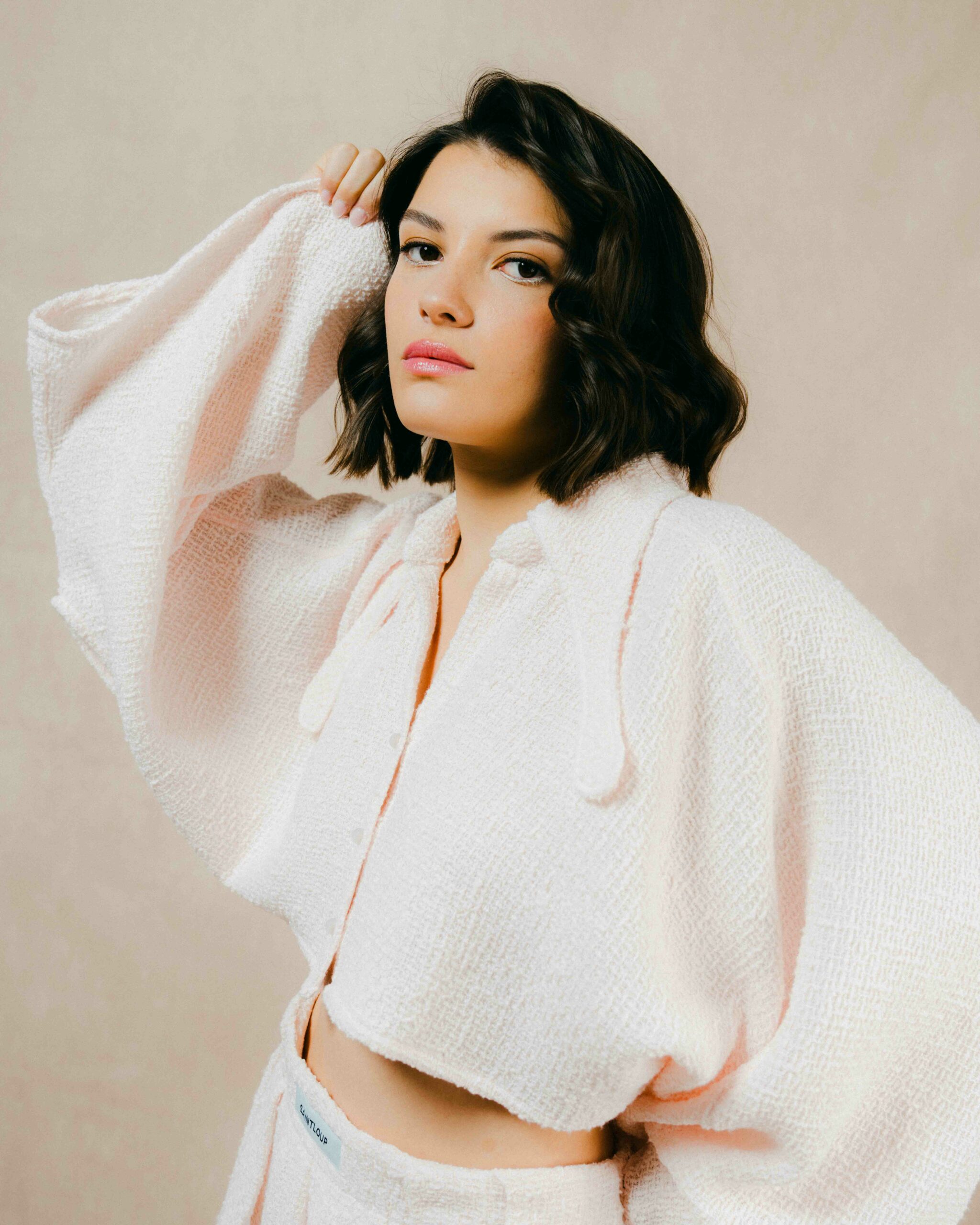 Il se distingue par son col à pans, véritable signature de l’atelier, qui souligne le travail de coupe et apporte une originalité discrète à la pièce. Sa longueur cropped vient structurer l’allure et équilibrer les volumes avec modernité.