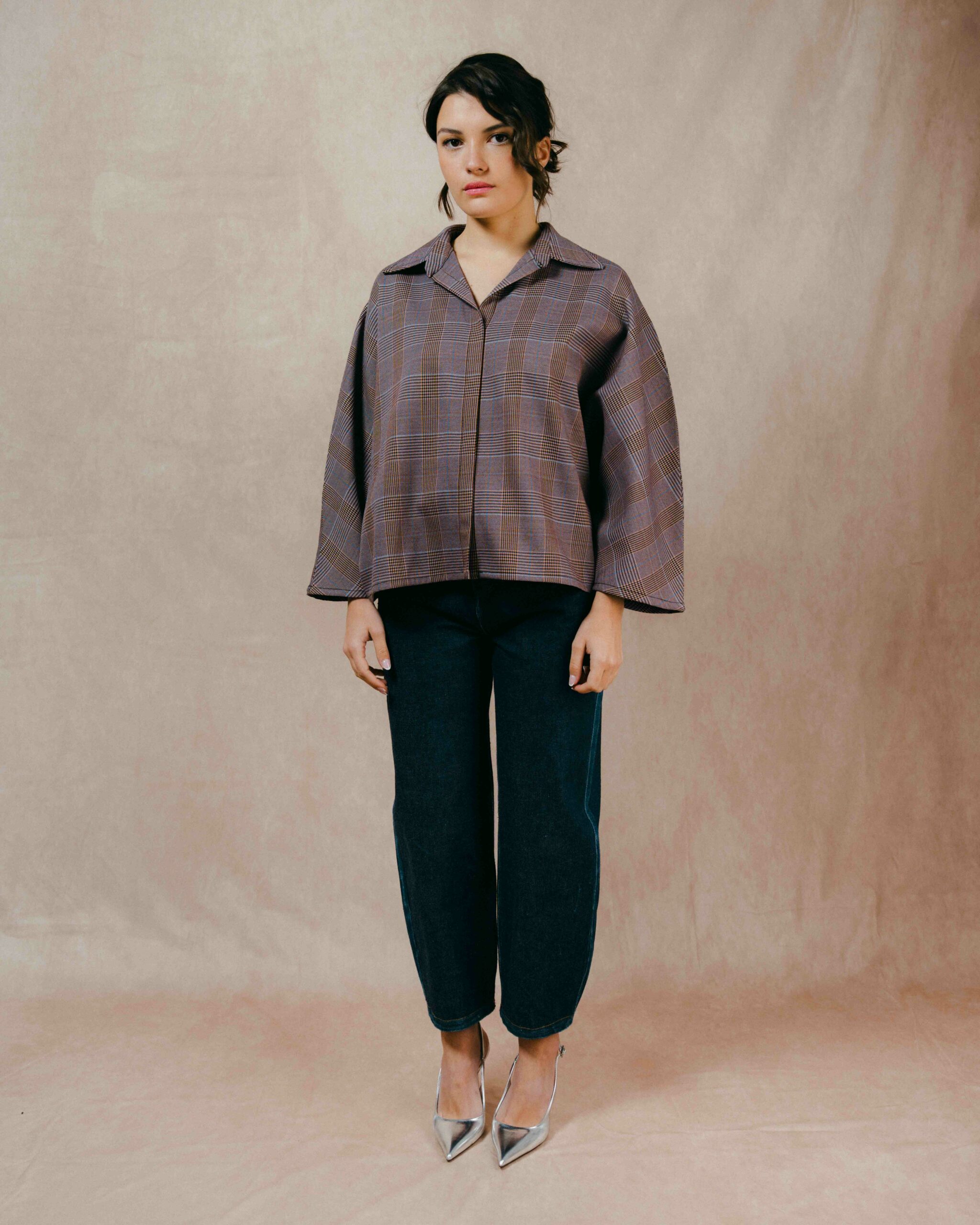 Déclinaison de notre chemisier drapé, ce modèle en reprend l’esprit tout en s’en affranchissant, dans une version épurée, sans jeu de plis. Sa coupe ample dessine une silhouette souple et actuelle, tandis que les manches larges, esprit chauve-souris, apportent aisance et caractère.