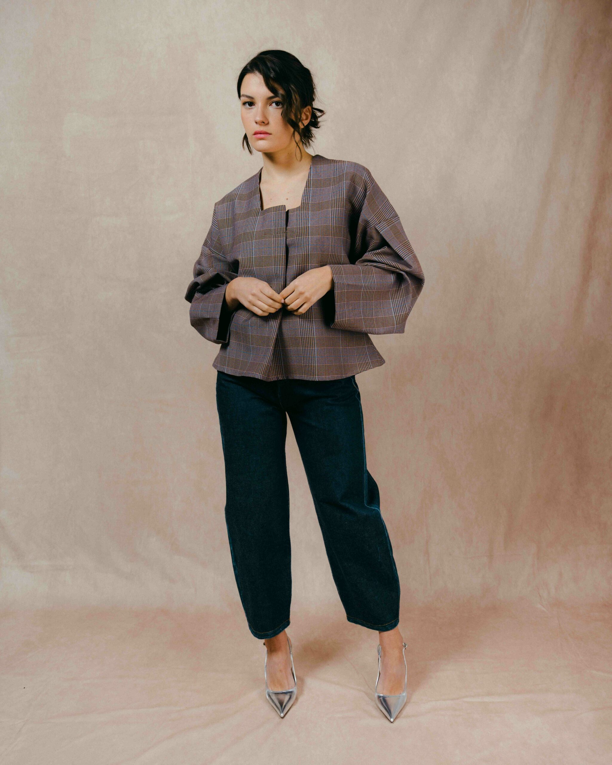 Ce jean se distingue par une coupe légèrement arrondie, qui structure la silhouette tout en conservant une grande liberté de mouvement. La ligne est nette à la taille et se dessine progressivement vers une jambe subtilement galbée.
