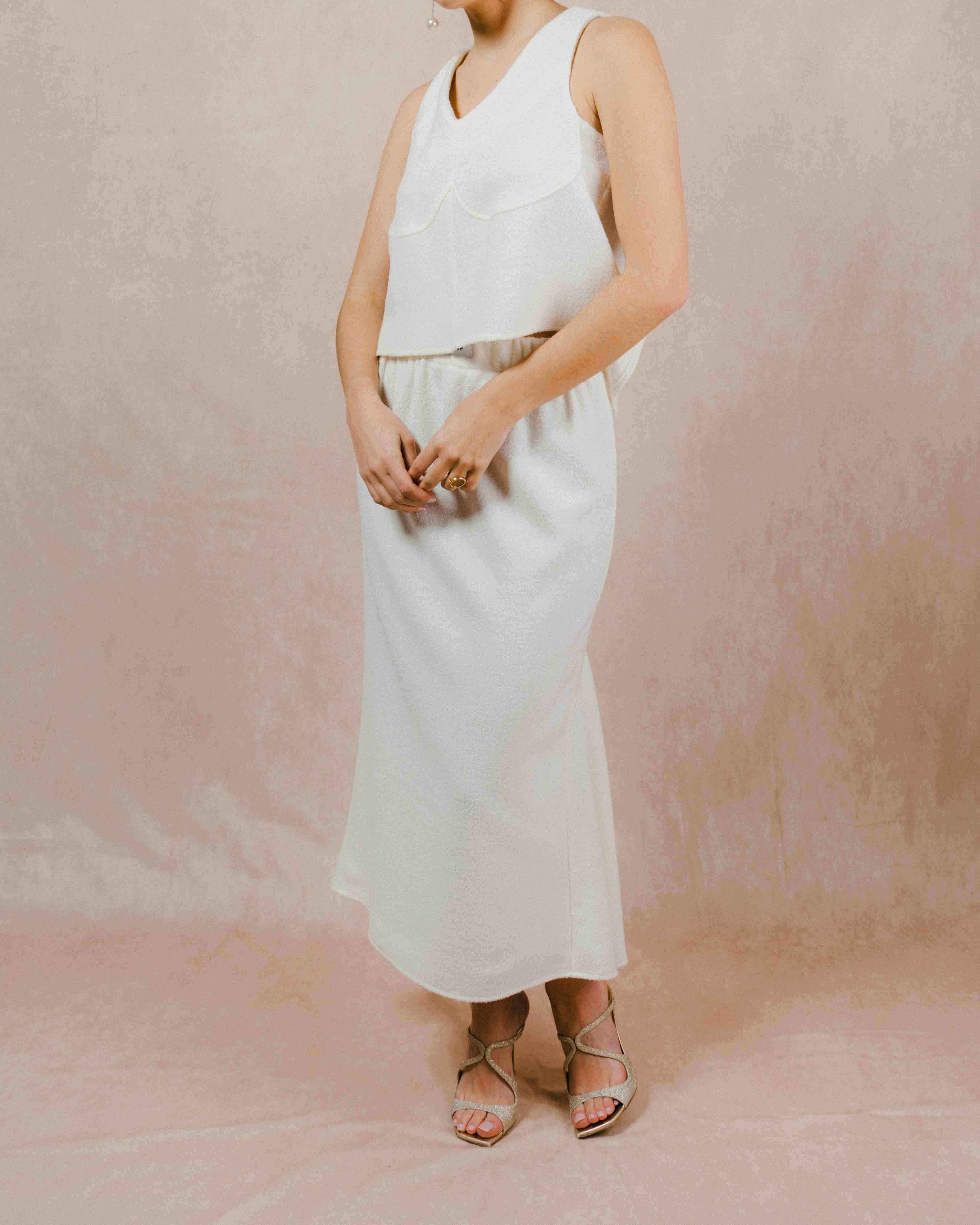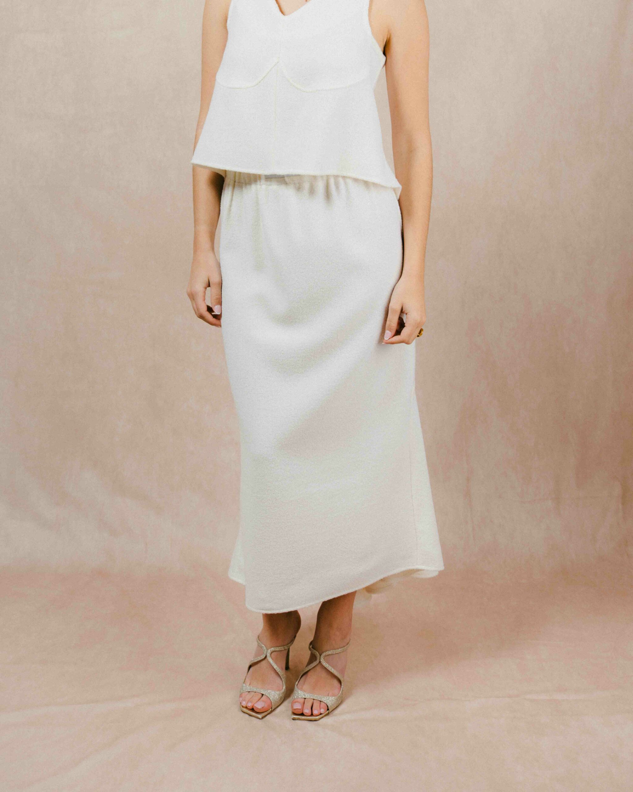 Cette jupe longue se distingue par une ligne épurée, pensée pour accompagner le mouvement avec élégance. Sa taille élastiquée assure confort et adaptabilité, tout en structurant la silhouette avec simplicité.