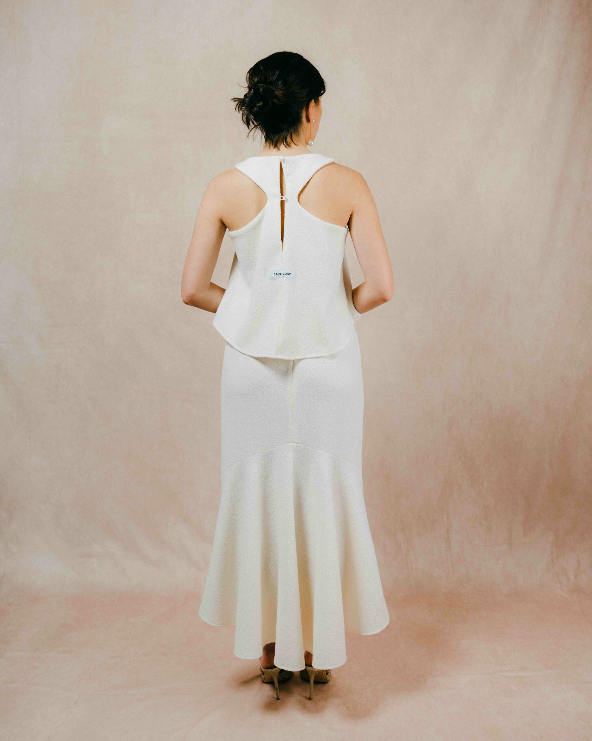 La coupe est travaillée par un jeu de découpes asymétriques qui viennent animer la ligne avec subtilité. À l’arrière, la construction se prolonge dans une découpe qui apporte relief et singularité à la pièce.