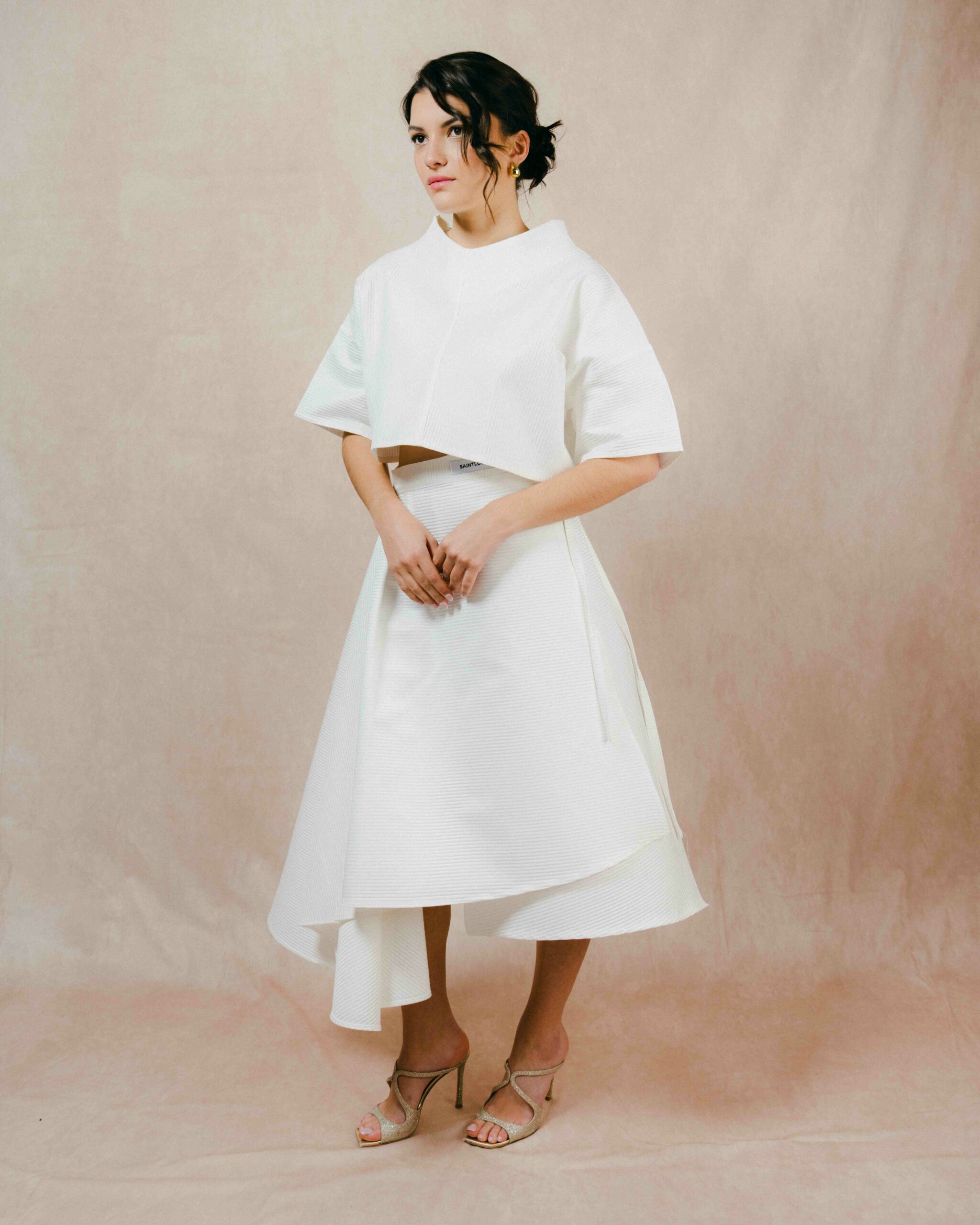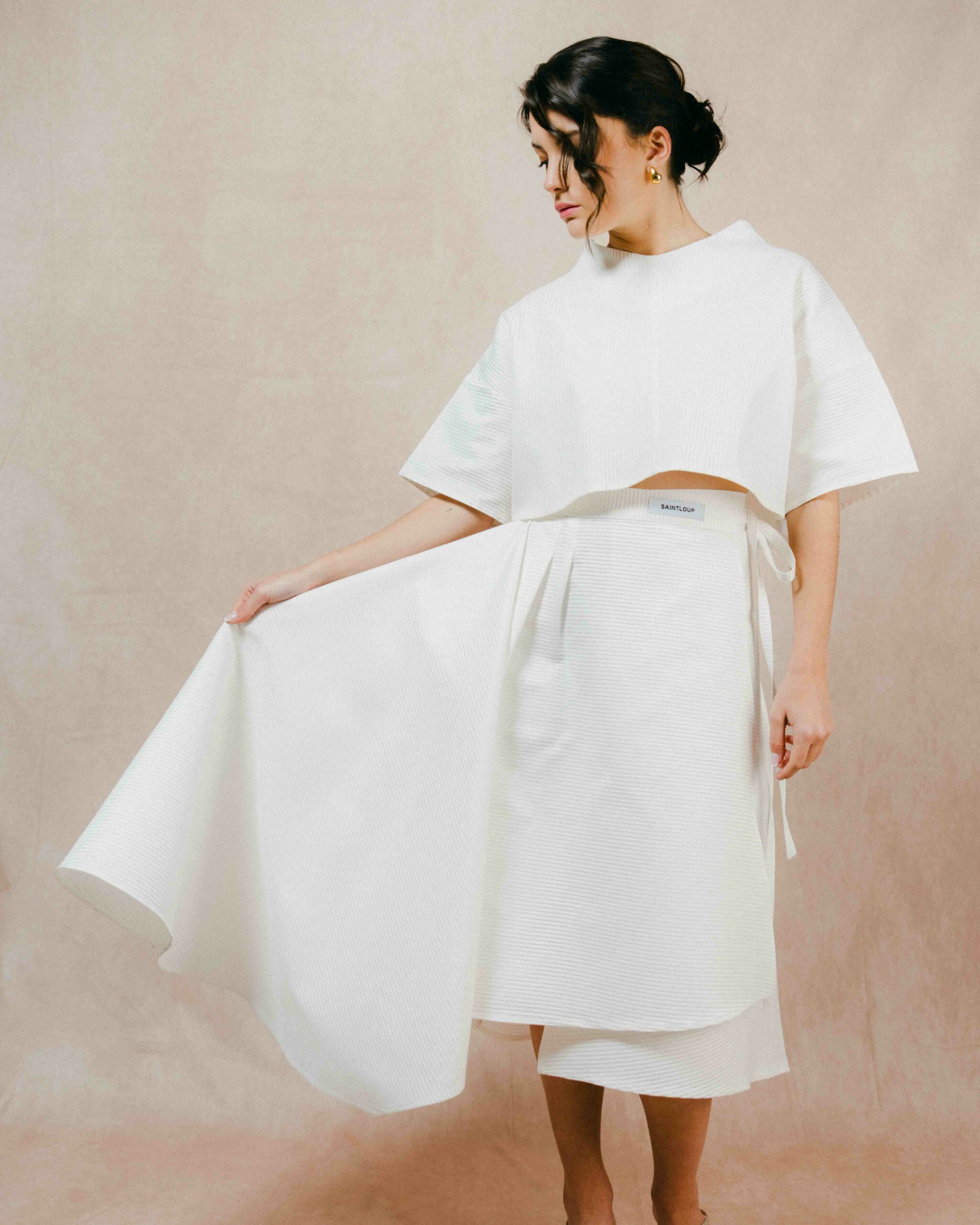 Ce travail de coupe apporte du relief et donne toute sa singularité à la pièce, avec un tombé ample et structuré à la fois. La taille se noue pour ajuster la jupe naturellement et souligner la silhouette.