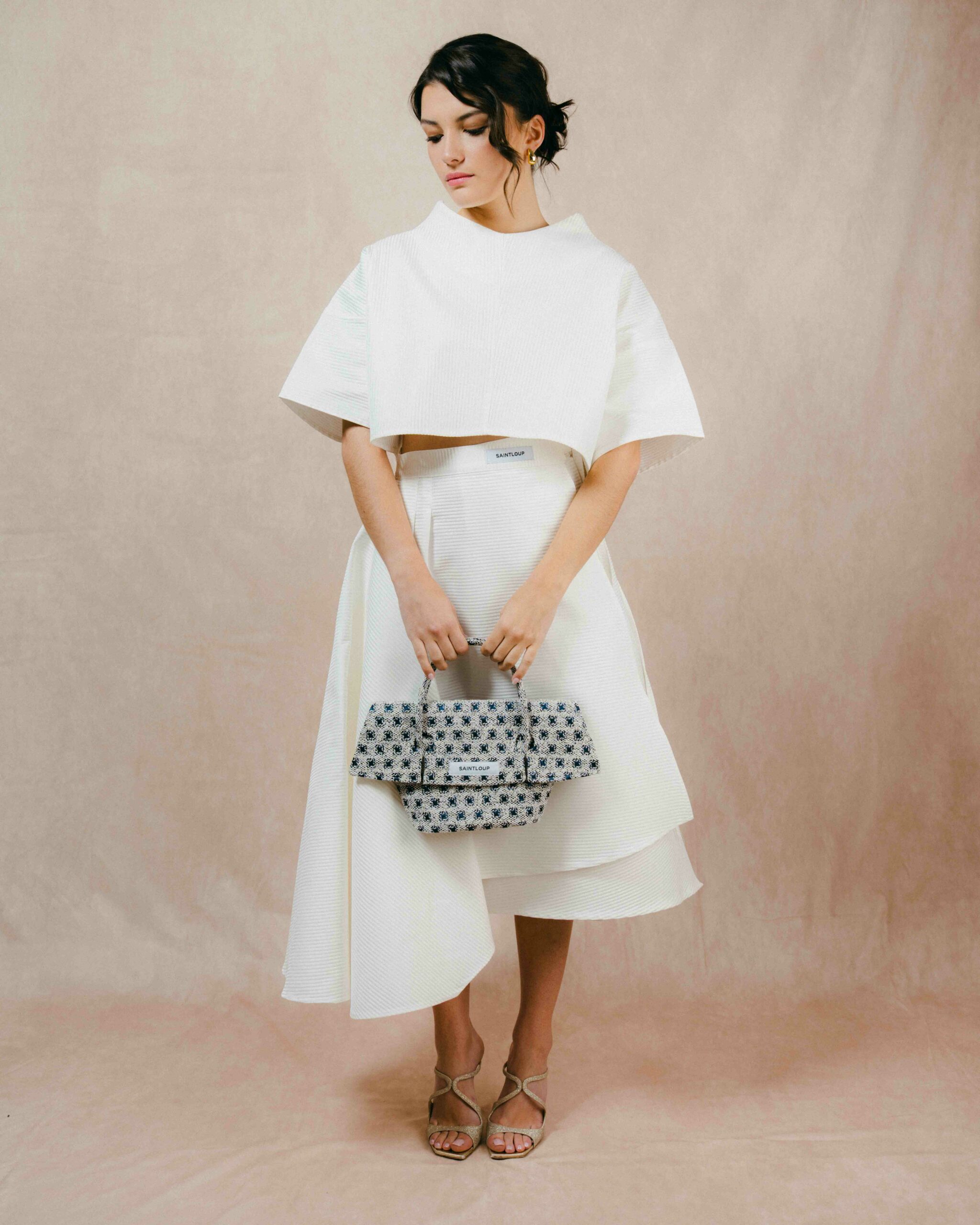 Une jupe portefeuille à la ligne fluide, pensée comme une pièce forte de la silhouette. Sa construction révèle un large pan de tissu qui vient se croiser et se superposer, créant un jeu de volumes et de mouvement très couture.