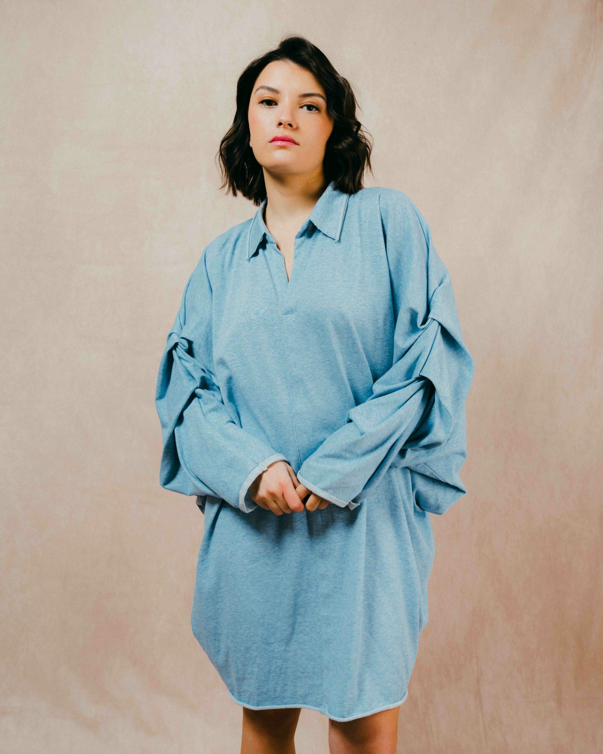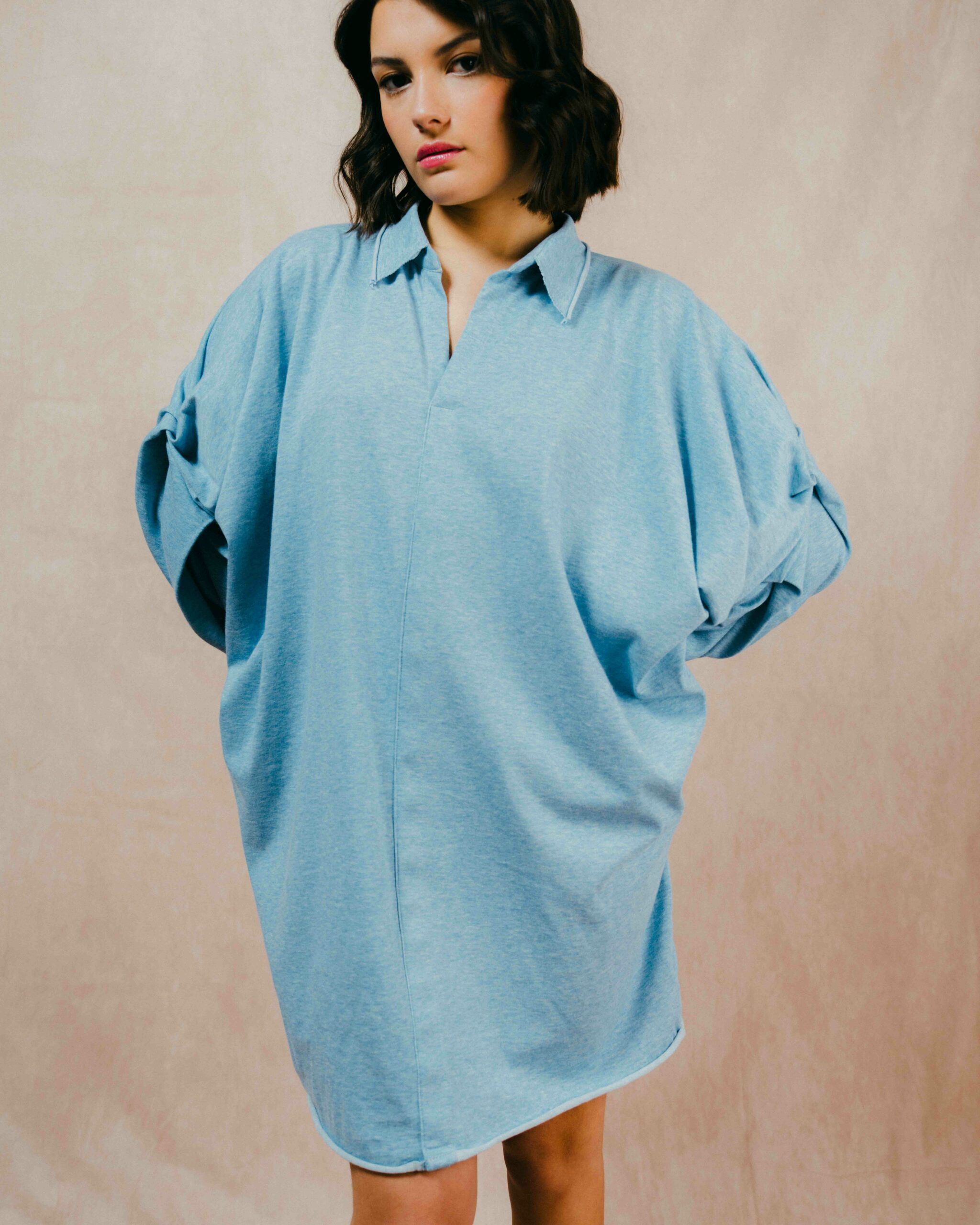 Une robe chemisier inspirée de notre chemisier drapé iconique, revisitée dans une version plus ample et effortless.