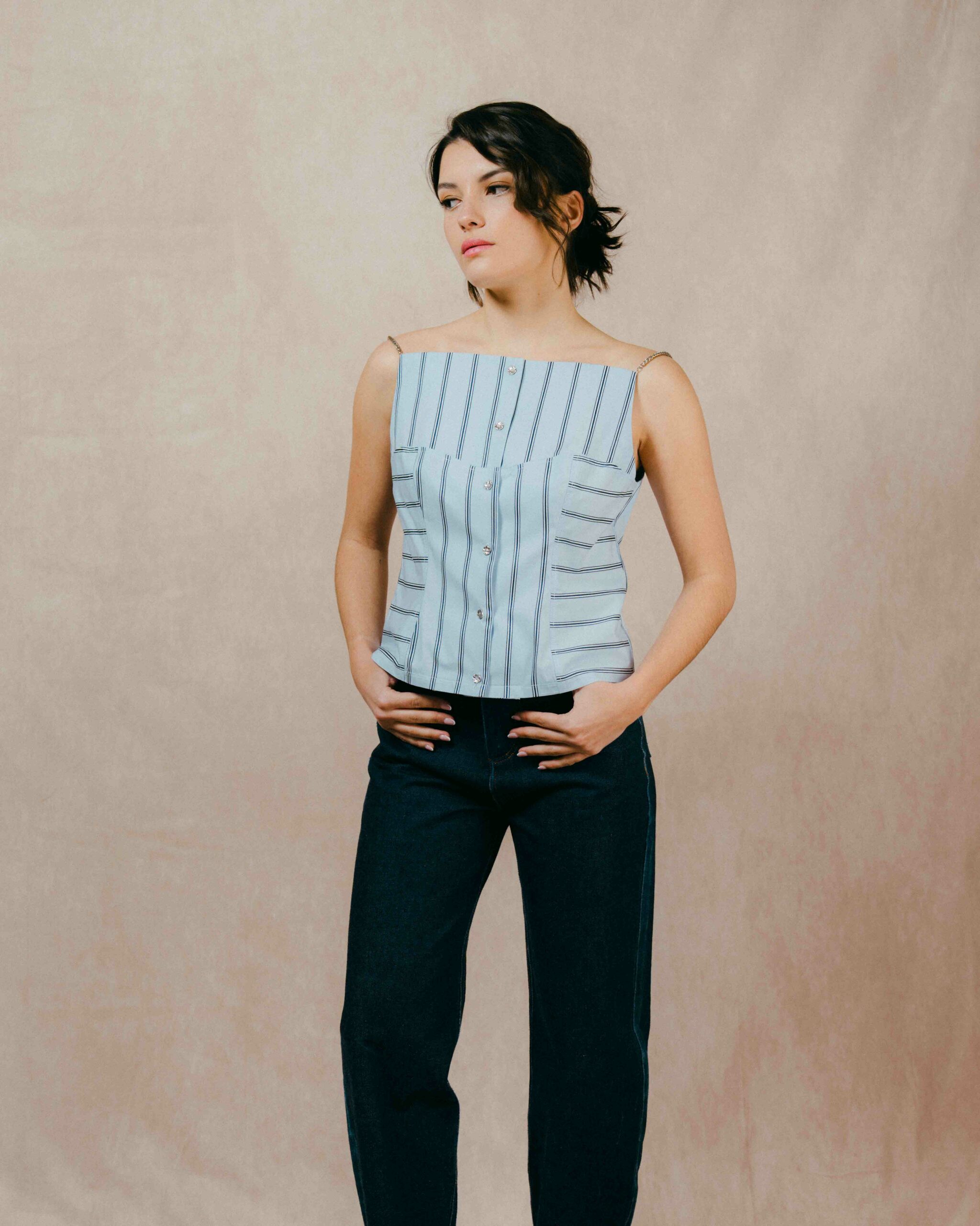 Un top structuré qui souligne la silhouette avec précision, tout en restant léger et agréable à porter.