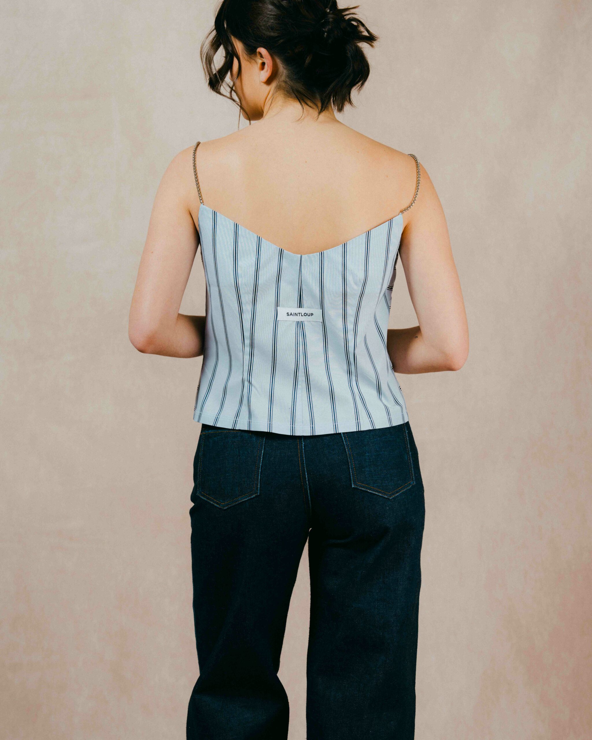 Les bretelles en chaîne apportent une touche subtilement précieuse, contrastant avec l’esprit tailoring du modèle et lui donnant une dimension plus habillée.