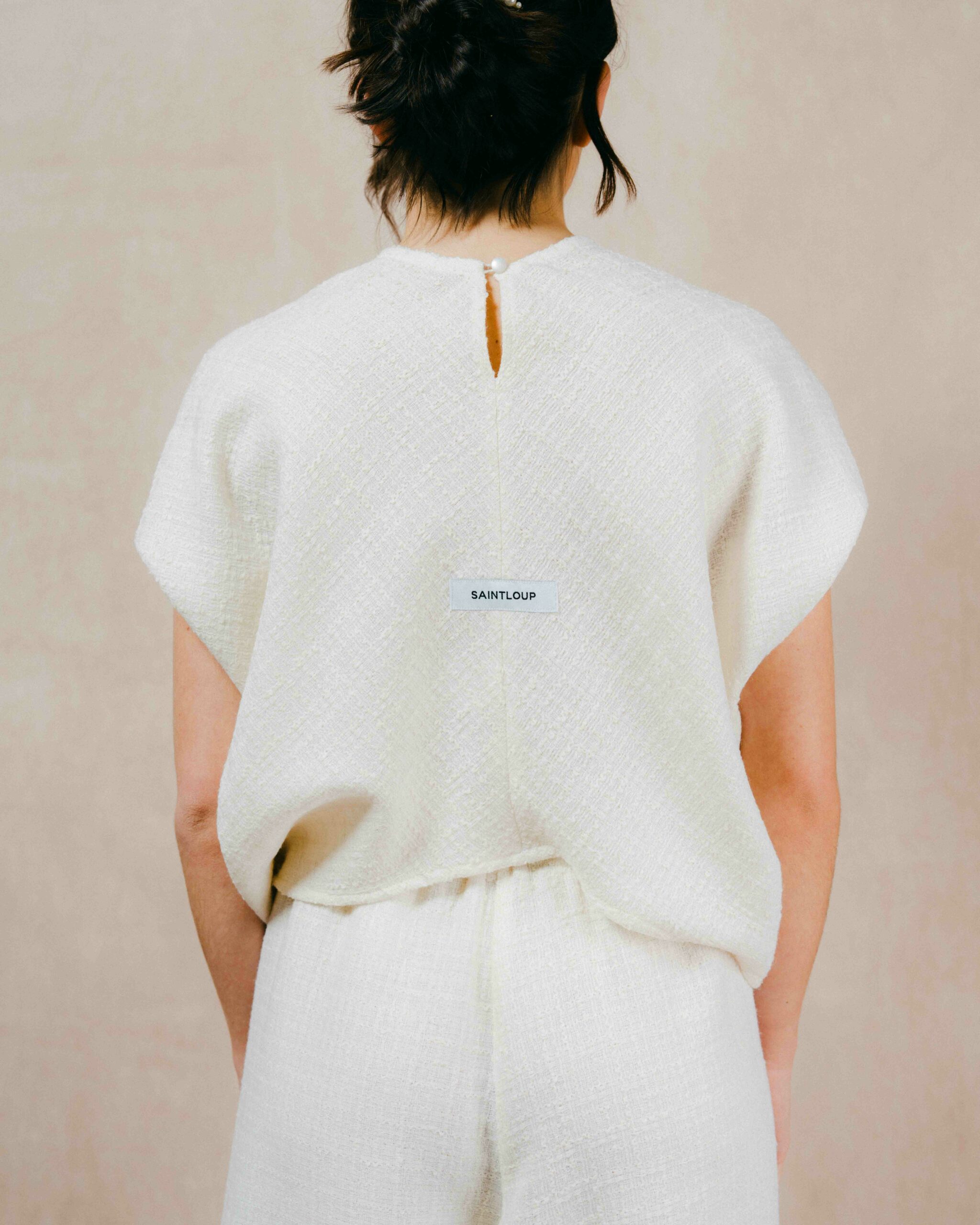 Un top à l’allure très couture, où la simplicité devient signature, pensé comme un essentiel élégant et facile à porter.