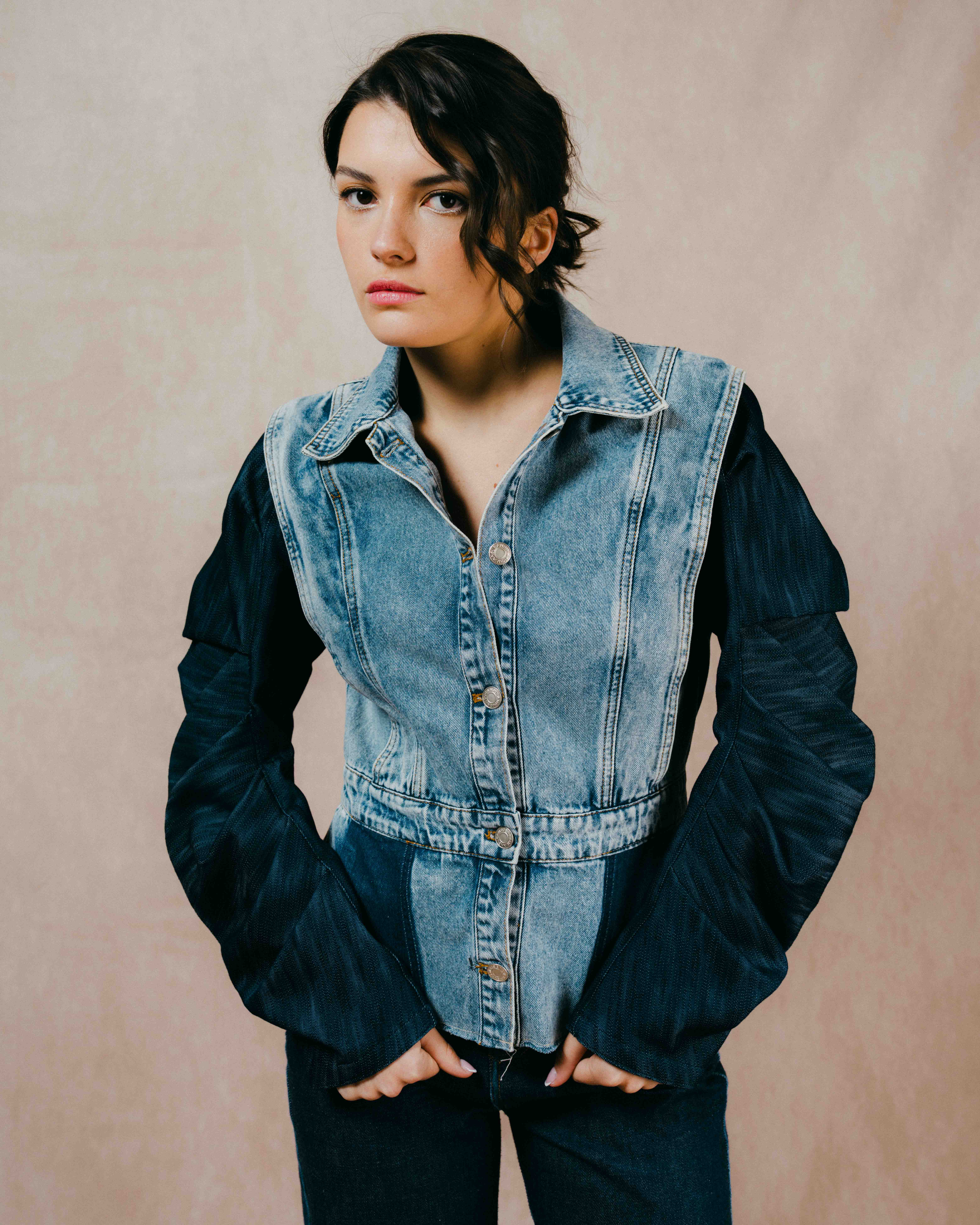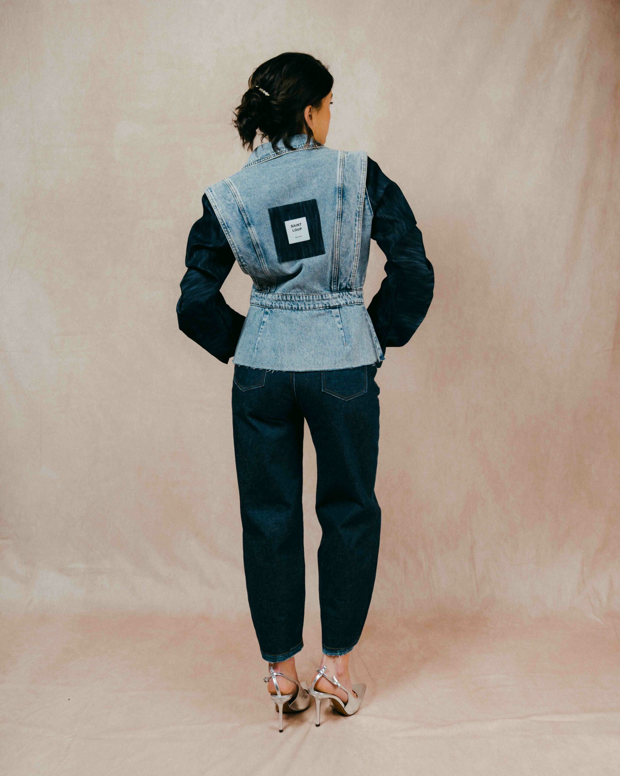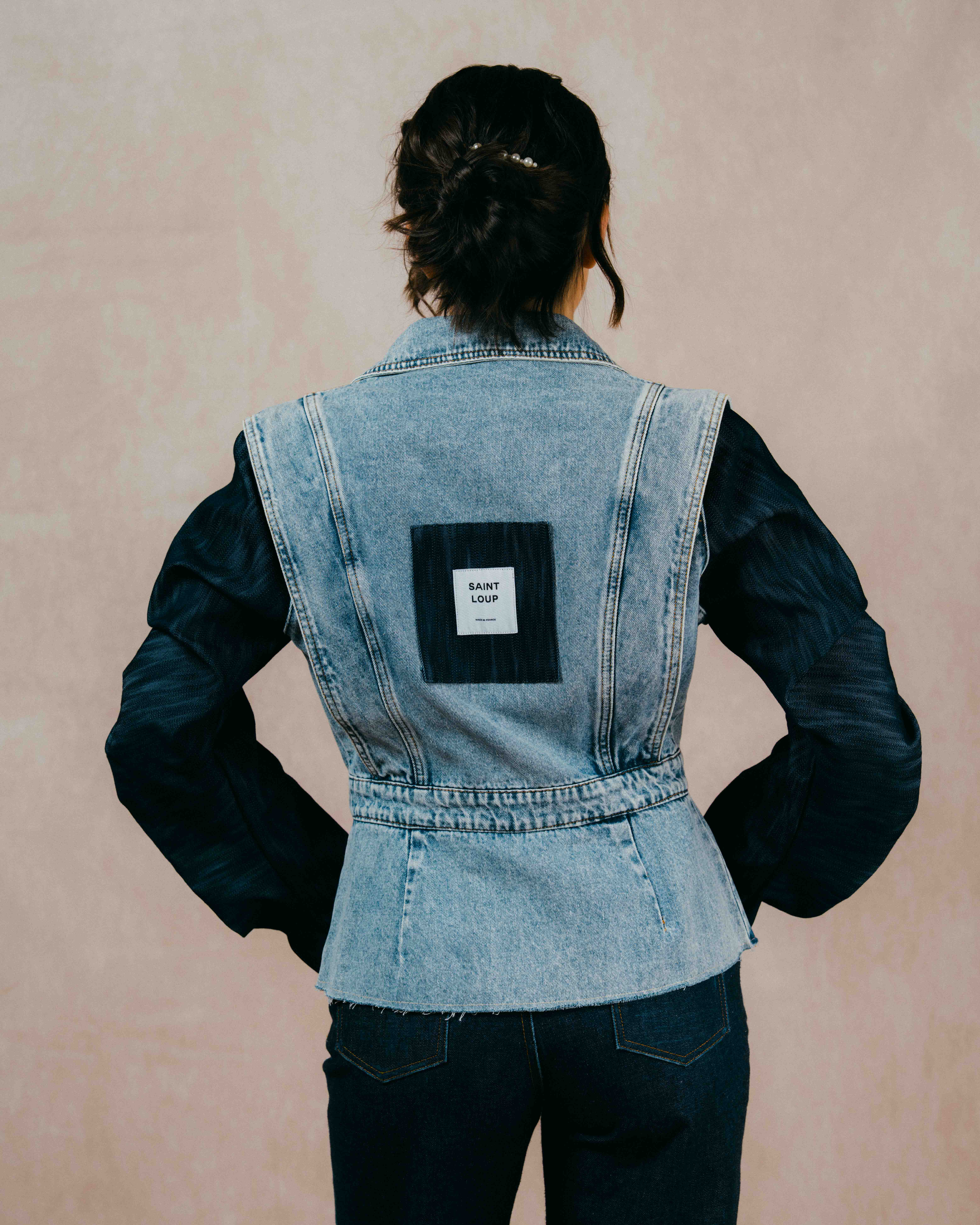Cette veste en denim s’inscrit comme une pièce signature du vestiaire, pensée autour d’un travail de coupe précis et d’un jeu de matières maîtrisé. Le contraste entre le denim clair du buste et le denim plus profond des manches structure immédiatement la silhouette.